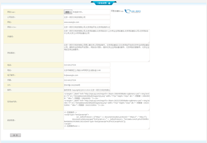 3、網(wǎng)站所有者信息設(shè)置(電話、地址、電子郵件、傳真、ICP、版權(quán)、在線QQ代碼、底部信息),這些內(nèi)容將在網(wǎng)站的固定位置進行展示,宣傳公司信息!