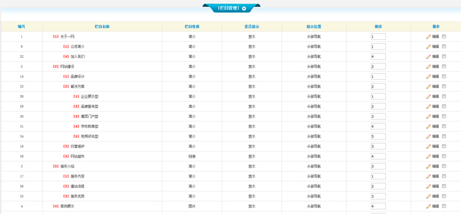 我們創(chuàng)建的欄目,以及默認(rèn)的欄目,都要在這里進(jìn)行管理。點擊欄目管理,右側(cè)信息會出現(xiàn)我們整個網(wǎng)站的所有欄目名稱、欄目性質(zhì)、是否顯示、顯示位置、排序和操作等信息。如圖所示: